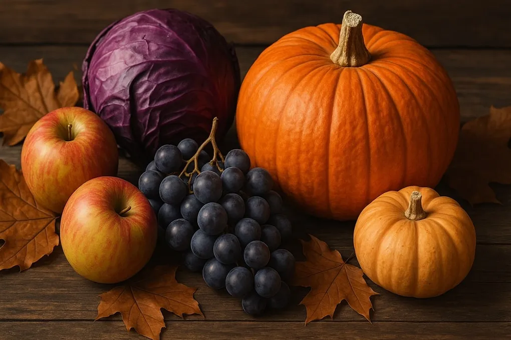- Herbst: Äpfel, Kürbis, Trauben, Rotkohl
